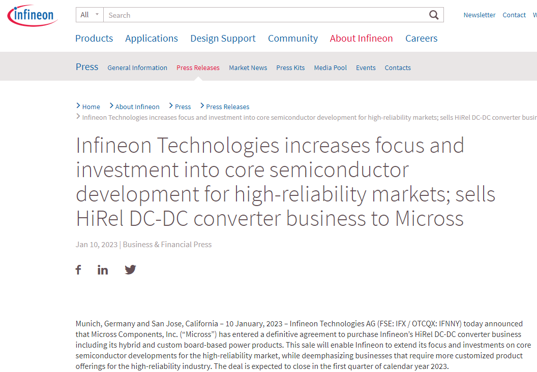 从英飞凌国际电子商情11日官网获悉,英飞凌宣布,已就向Micross出售英飞凌的HiRel DC-DC转换器业务达成最终协议,包括其混合和定制板载电源产品。