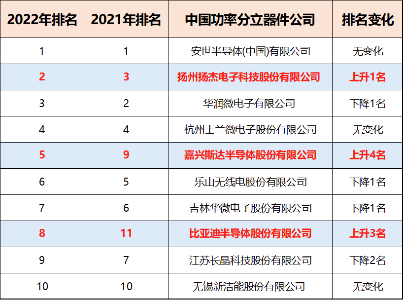 2022年,中国多家功率分立器件企业又一次迎来大幅成长。据芯谋研究统计,全球功率分立器件产业营收前20公司中,中国企业有5家,分别是排名第5的安世半导体、排名第12的扬州扬杰、排名第13的华润微、排名第14的杭州士兰微、排名第19的嘉兴斯达。位居全球前20的中国功率分立器件公司总营收持续增长,排名也有上升。