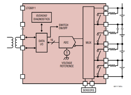 LTC6811-1是ADI的第四代BMS IC,是一款电池组监视器,最高可对12个串联电池进行电压检测,测量精度比ST L9963更高,总测量误差小于1.2mV,完成12节的电池检测仅需290μs。LTC6811-1可将多节电池串联起来,因此该芯片可在高电压的电池串中完成电池状态实时监测。该芯片给还具有ISOSPI接口,可实现与器件之间高速的远程通信。LTC6811-1能将12组电池通过菊花链连接,实现多通道通信的功能,监测电池状态,并根据电池当前状态进行暂停和启动操作,该芯片采用隔离式电源供电。